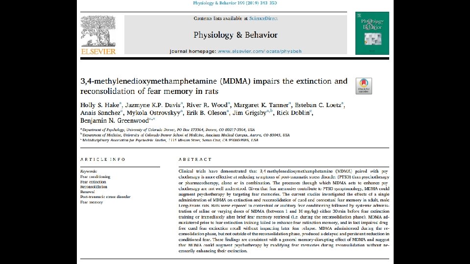 Discussion/Take Away • Dose dependent extinction response to MDMA • Inverse relationship – more MDMA, less freezing in less time • MDMA administration during auditory CS fear extinction training has no impact on fear renewal or contextual fear extinction memory retrieval • However, MDMA administered during fear memory reconsolidation reduces later fear expression • All together this means MDMA seems to have the most therapeutic effect if administered during the fear extinction learning process • Emphasizes patients be encouraged to attend to traumatic memories, rather than structured, exposure-based strategies, ultimately triggering recall & reconsolidation of traumatic memories w/o facilitating their extinction