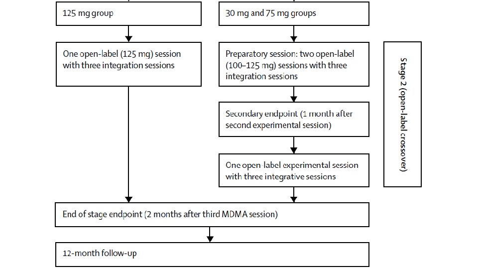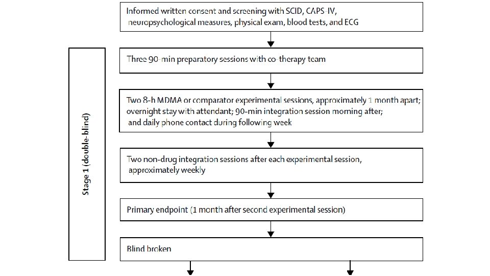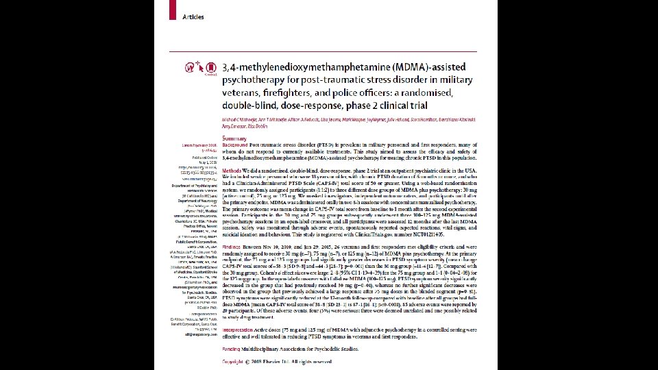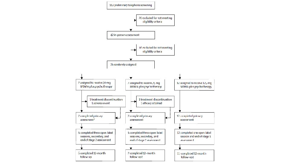 Methods/Background • Randomized, double-blind, dose-response phase 2 clinical trial • Patients with CAPS-IV score of 50+ assigned to 30, 75, or 125 mg MDMA dose • MDMA administered orally in two 8 hr sessions w/ concomitant psychotherapy • Blind broken, patients receiving 30 and 75 mg doses then received three 100125 mg MDMA-assisted psychotherapy sessions • Parameters measured during, 1 month, and 12 months following MDMAassisted psychotherapy sessions