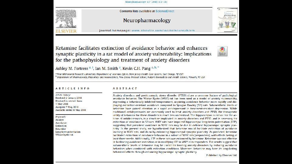 Discussion/Take Away • Ketamine facilitates extinction of avoidance behavior in anxiety-vulnerable rats • This has been shown in humans as well • However, ketamine responder and non-responder populations exist • Antidepressant response due to ketamine metabolite HNK increasing Glu. A 1, Glu. A 2, & BDNF synthesis in Hipp, not PFC • Ketamine facilitated hippocampal LTP in WKY responder rats, humans too? • specifically affects the medial entorhinal cortex to dentate gyrus pathway through the medial perforant pathway • WKY and PTSD hippocampus have less inhibitory neurons, study GABA?