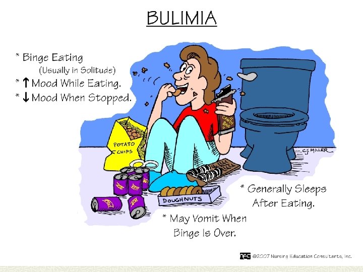 Eating disorders More common in : 1. Young females. 2. Upper middle or middle class. 3. Living in socially competitive surroundings. Two major types : 1. Bulimia nervosa 2. Anorexia nervosa