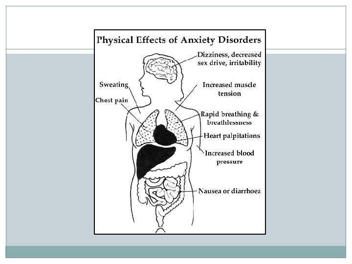 Theories: Anxiety Disorders - continued Abnormal control of glutamate plays role in anxiety disorders. Hormonal changes in pregnant women affect certain anxiety disorders. Lactic acid may precipitate anxiety. Caffeine and nicotine may trigger panic attacks. Genetic theories: strong evidence for familial or genetic predisposition for anxiety disorders Psychosocial theories: in psychoanalytic theory, anxiety is viewed as sign of psychologic conflict; anxiety is the outcome of repressing forbidden impulses