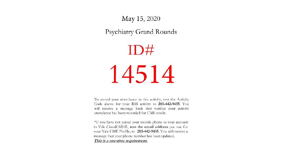 What will reopening look like in psychiatry • Censuses rising in ED and on inpatient units (YNHH, VA) • First step likely to be nearly full return to on-site inpatient work • Patients already tested in ED before going to Units • Asymptomatic faculty/staff/trainees to be tested periodically • End platooning arrangements • “At risk” groups will not be required to come in initially, but will not be prohibited from returning to work • PPE supplies will support. • General principles consistent across institutions, but implementation times may differ for many reasons (PPE supplies, etc. )