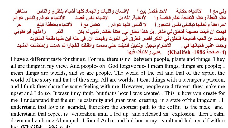2 -the cat , Anbar The cat reflects herself and her internal feeling of alienation especially her being under the marital authority. The domestic animal , cat symbolizes her essence as she wants to live outer limitation or border determined by the social and cultural values. ﻓﻴﻚ ﺗﺠﺴﺪ ﻃﻔﻮﻟ ﺣﺮﻣ ﻣﻨﻬﺎ ﻣﺎ. ﺣﺲ ﺑﻘﻠﺒﻲ ﻳﻨﺴﺎﺡ ﺫﻭﺏ ﻋﻨﺒﺮ ﻭﻟﻬﺬﺍ ﺃﺴﻤﻴﺘﻚ ﻋﻨﺒ. ﺣﺒﻚ ﺟﺪﺍ. ﺃﺤ ﺑﻘﻠﺒﻲ ﻳﺪﻭﺏ ﻋﻄﻔﺎ ﻭﺣﻨﺎﻧﺎ ﻭﻧﺒﻬﺎﺭ. ﺃﺤﺒﻚ. ﺣﺒﻴﺒﺘﻲ ﻋﻨﺒ ﻭﻣﻦ ﺧﻼﻟﻚ ﺃﺠ ﻋﺰﺍﺋﻲ ﻭﺃﺴﻘ ﻛﺒﻮﺍﺗﻲ ﻭﺃﺤﻤﻠﻚ ﻋﻠﻰ ﺍﻟﺬﺭﺍﻋﻴﻦ ﻃﻔﻠ ﻭﻓﻲ ﺍﻟﻌﻴﻨﻴﻦ ﺃﻤﻨﻴﺔ ﻭﻣﺸﻬﺪﺍ ﺧﺎﺭﻗ. ﻭﻓﻴﻚ ﺗﺠﺴﺪﺕ ﺻﻔﺎﺕ ﺍﻧﻮﺛﺔ ﺍﻟﻤﺸﺘﺮﻛﺔ. ﻭﻣﺴﺘﻘﺒﻞ . ﻳﺎﻟﻠﺮﻭﻋﺔ !ﻭﻫﺬﺍ ﻣﺼﺪﺭ ﻗﻮﺗﻚ ﻭﺳﺮ ﺣﺮﻳﺘﻚ ، ﻻ ﺗﻤﻠﻜﻴﻦ ﻭﻻ ﺗﺗﻠﻜﻴﻦ. . ﺃﺮﻯ ﻓﻴﻬﻤﺎ ﺟﺮﺃﺔ ﻓﻘﺪﺗﻬﺎ ﻣﻨﺬ ﺯﻣﻦ ﺑﻌﻴﺪ ، ﻭﺗﺒﻬﺮﻧﻲ ﻋﻴﻨﺎﻙ. ﻟﻠﻤﻌﻘﻮﻝ ﻭﺍﻟﻤﺠﻬﻮﻝ My beloved Anbar, I love it. I feel my heart is melting out of kindness, tenderness and fascination. I love you so much. I feel my heart is flowing like a melting Amber and therefore, I call you Anbar. In you, a childhood was embodied of which I was deprived of in the past and future. In you were embodied the characteristics of shared femininity. Through you, I find my consolation, drop my failure and carry you on my arms as a child, and in the eyes, a wish and an extraordinary scene that goes beyond the reasonable and the unknown. Your eyes are dazzling me, I see in them a boldness I lost a long time ago……………… You do not possess and are not possessed, how wonderful! that is the source of your strength and the secret of your freedom, (1986, p. 33)
