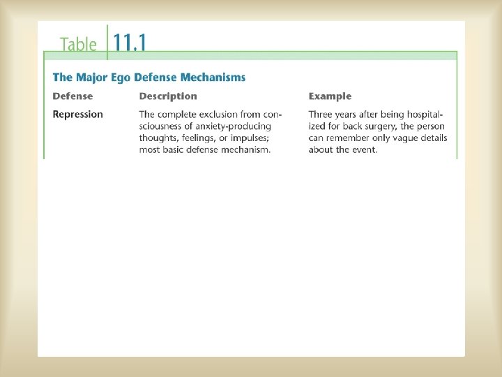 Repression • Puts anxiety-producing thoughts, feelings, and memories into the unconscious mind • The basis for all other defense mechanisms