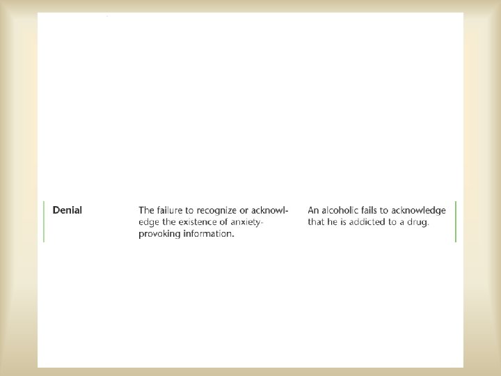 Denial • Lets an anxious person refuse to admit that something unpleasant is happening