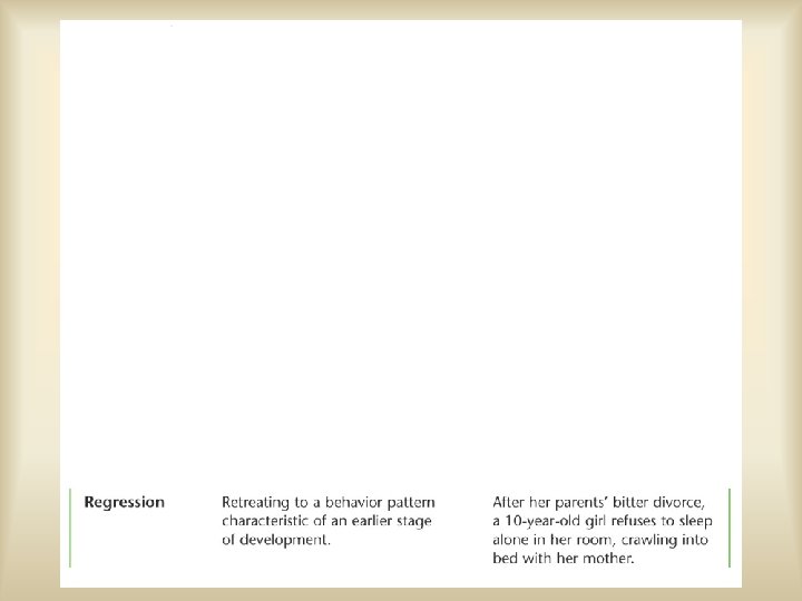 Regression • Allows an anxious person to retreat to a more comfortable, infantile stage of life