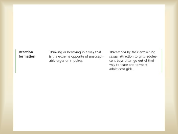 Reaction Formation • Replacing an unacceptable wish with its opposite