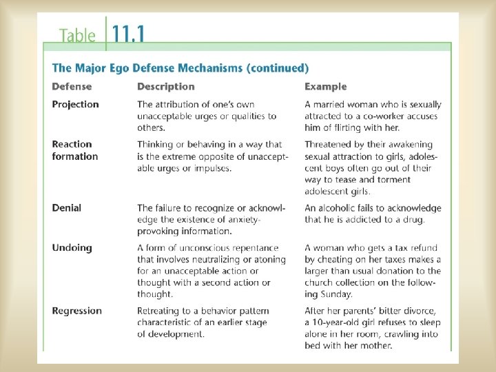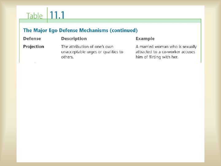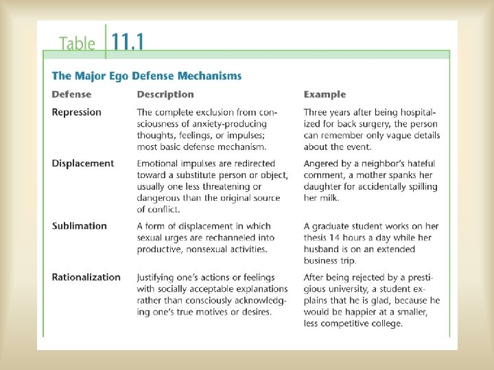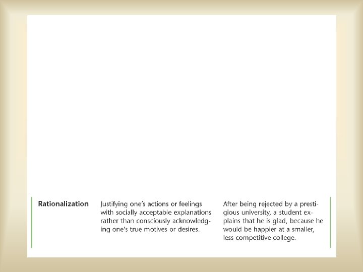 Rationalization • Displaces real, anxiety-provoking explanations with more comforting justifications for one’s actions • Reasoning away anxiety-producing thoughts