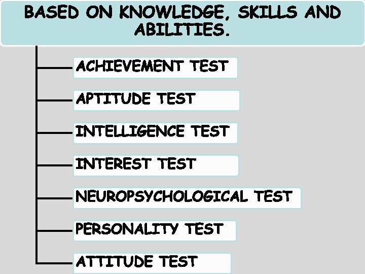 Individual And Group Tests • Individual tests are designed to administered, to one person at a time. Eg: Rorschach inkblot test. be • Group tests are designed to be administered to a large number of people at the same time. Eg: Achievement test.