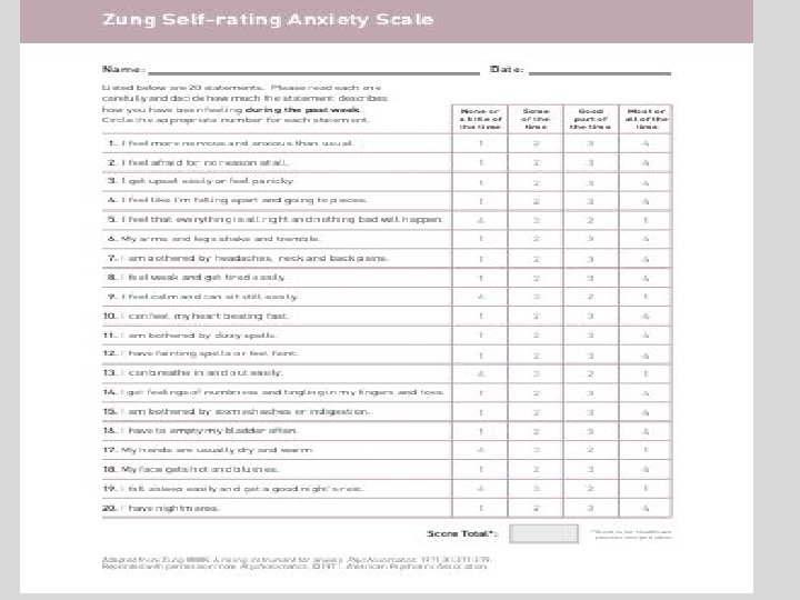 Specific Clinical Tests • These attempt to measure specific clinical matters, such as current level of anxiety and depression. • Eg: Hamilton rating scale for depression, Brief psychiatric rating scale.