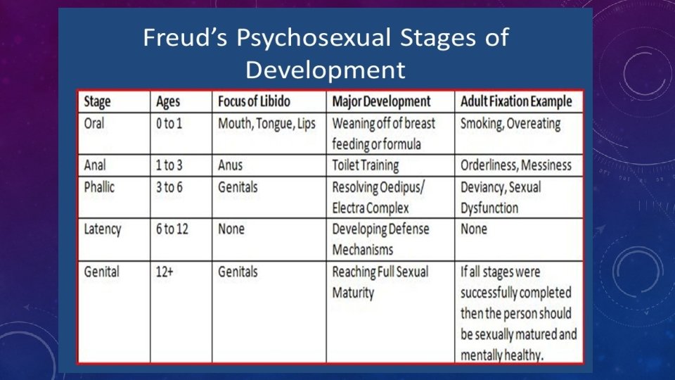 FREUD’S PSYCHOSEXUAL THEORY • The theory of psychosexual development describes how personality develops during childhood. • Freud believed that personality develops through a series of childhood stages in which the pleasureseeking energies of the id become focused on certain erogenous areas. This psychosexual energy, or libido, was described as the driving force behind behavior.
