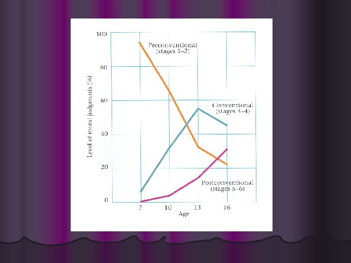 Kohlberg’s Stages Level II Stage Orientation 3 “Good Boy/Good Girl” Conventional q Right & wrong is determined by close others’ approval or disapproval. 4 q “Law & Order” Orientation Right and wrong is determined by society’s rules and law, which should be obeyed rigidly.