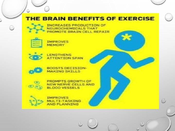 • 4. INCREASED “HAPPY” HORMONES: REGULAR AEROBIC EXERCISE INCREASES THE RELEASE OF ENDORPHINS THROUGHOUT THE BODY, WHICH ARE ASSOCIATED WITH FEELINGS OF HAPPINESS AND FEEL-GOOD SENSATION. • 5. INSPIRES CREATIVITY: HAVE WRITER’S BLOCK? TRY TAKING A QUICK JOG TO GET YOUR MUSCLES MOVING AND CHANCES ARE YOU WILL GET A SPARK OF CREATIVITY AND FOCUS WHEN YOU GO BACK TO THE COMPUTER DUE TO THE BRAIN STIMULATION YOU’VE GENERATED. • 6. REDUCTION OF ANXIETY AND MOOD DISORDERS: YEP THAT’S RIGHT! EXERCISE HAS BEEN PROVEN TO BE A VERY EFFECTIVE MEDICINE IN ACUTELY REDUCING ANXIETY, DEPRESSION AND OTHER MENTAL DISORDER