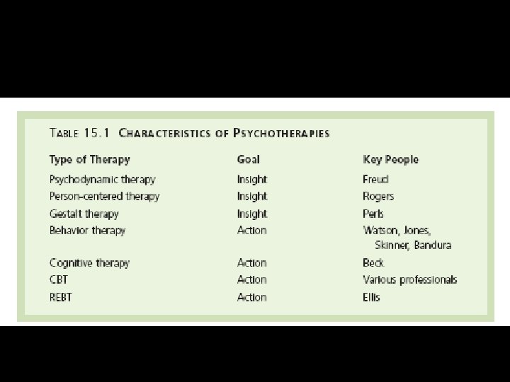 Therapy • Therapy - treatment methods aimed at making people feel better and function more effectively. • Psychotherapy - therapy for mental disorders in which a person with a problem talks with a psychological professional. – Insight therapies - psychotherapies in which the main goal is helping people to gain insight with respect to their behavior, thoughts, and feelings. – Action therapy - psychotherapy in which the main goal is to change disordered or inappropriate behavior directly. • Biomedical therapy - therapy for mental disorders in which a person with a problem is treated with biological or medical methods to relieve symptoms.