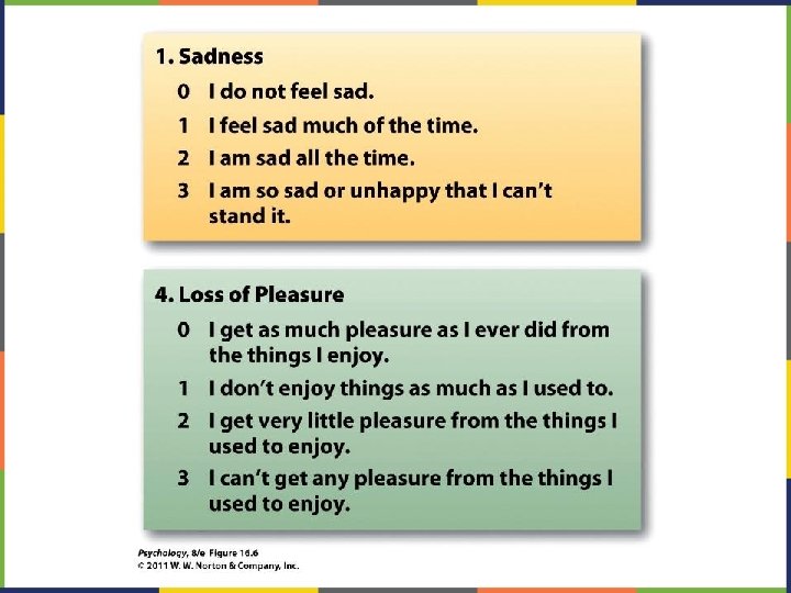 DEPRESSION • Life crises often trigger depression. • However, crises by themselves do not cause the disorder. • Aaron Beck • negative cognitive schema • Explanatory style • Individuals who explain bad things that happen as the result of internal, global, and stable factors have an elevated risk of depression.