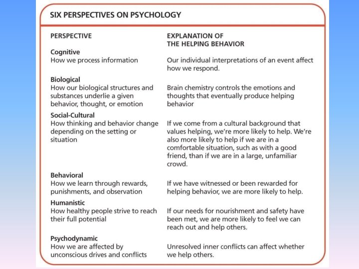 Psychological Perspectives • Method of classifying a collection of ideas • Also called “schools of thought” • Also called “psychological approaches” • To view behavior from a particular perspective