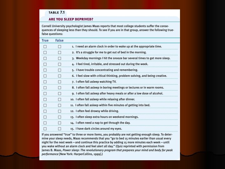 Interesting Sleep Notes l Can you learn during sleep? l Up to 25 years old men spend ½ their time sleeping in an aroused state l 1942 – 7. 6 hours of sleep l 2001 – 6. 7 hours of sleep l Invention of light