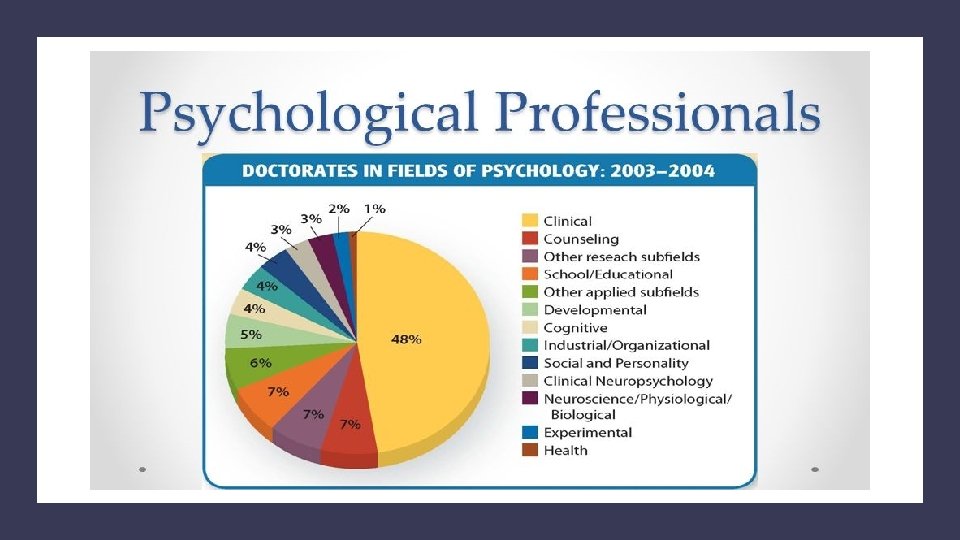 Clinical vs. Counseling About 50% of all psychologists Counseling psychologists = deal with “normal” problems, like stress caused by career change or marital problems. Clinical psychologists = deal with more serious problems or mental illness Career options include: • Licensed social workers • Counseling psychologists • Clinical psychologists • Psychiatrists • Psychoanalysts