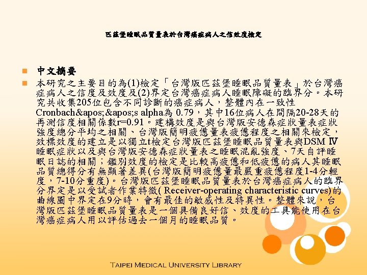 Psychometric Evaluation of the Pittsburgh Sleep Quality Index in Taiwanese Cancer Patients n n 英文摘要 The purpose of this study was to validate the Taiwanese version of the Pittsburgh Sleep Quality Index (PSQI-T) and explore the cutoff point for defining sleep disturbance in a sample of 205 Taiwanese patients with multiple diagnoses of cancer. The internal consistency Cronbach alpha was 0. 79. The test-retest reliability was 0. 91 over a 20 -28 day interval in a sample of 16 patients. Construct validity was established by correlating the MADSI-T mean scores and BFI-T average fatigue scores. Criterion validity was examined by examining the relationship between PSQI scores and DSMⅣ, and by correlating the item of sleep disturbance of MADSI-T and 7 -day sleep log. Known-group validity was established by comparing BFIT scores between patients having low fatigue status and those having high fatigue status (BFI-T score 1 -4 vs. 7 -10 ). The cutoff point of PSQI-T was established by ROC curve when limits in 9 can have the best sensitivity and the specificity. Result suggests that the PSQI-T is a reliable, valid, and sensitive instrument for measuring sleep quality among Taiwanese cancer patients.