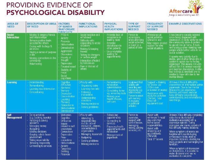 Resources - evidence of psychosocial disability Aftercare Australia ● National NGO mental health service ● Research and relationships across government and social services ● NDIS registered - services and resources specifically to psychosocial disability ● Completing the NDIS process for your patients video ● Providing Evidence of Psychological Disability resource