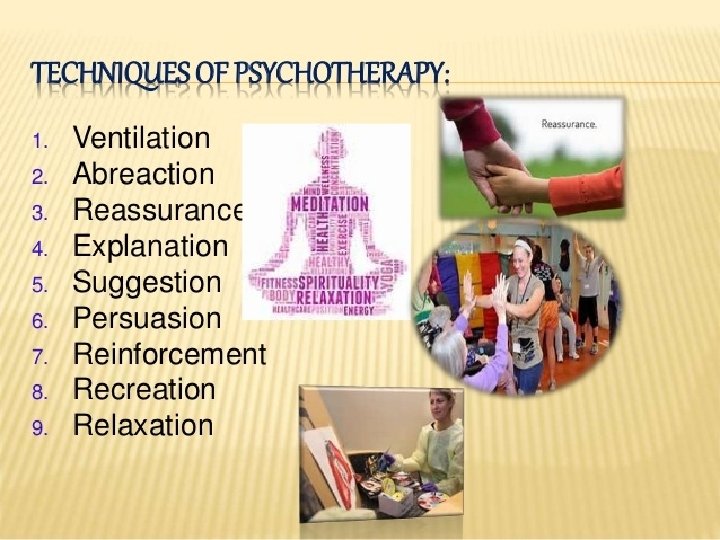 Ventilation • Ventilation means • This is supportive Technique where in the allowing the client to client is encouraged to speak about his Talk about his problems without problems. By Talking, restriction or inhibition. the client's Emotional • Ventilation is an distress decreases, and important Technique in both he and the counselor obtain a Therapy, particularly clearer picture of the during the early problem situation. phases.