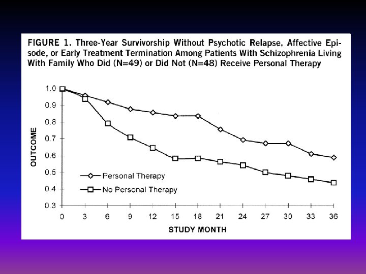 Personal therapy: stages (contd) • Phase II (intermediate; 7 - 18 months) – Continued psychoeducation (goal: self- awareness; recognition of prodromal signs of relapse – Acquisition of adaptive techniques: Relaxation training; guided imagery/ music; active distraction techniques; basic conflict resolution skills Hogarty et al 1995