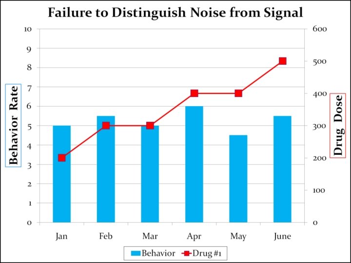 #3 -Failure to Distinguish Between Signal and Noise “…a failure to distinguish between signal and noise can lead the clinical team to respond to “blips” and “clusters” of behavior as if they represented a significant trend that could represent a change in the underlying disorder. “ Signal (trend) = steady increase or decrease in the frequency of a monitored symptomatic behavior that occurs over a period of several weeks or months. Noise (blips) = a noticeable change in frequency which occurs for no observable reason and is transient.