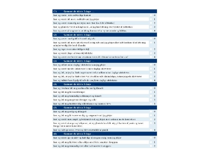 Hamilton skala • Score: 0 -7 8 -12 13 -17 18 -29 30+ ingen depression mild depression mindre end major depression psykotisk