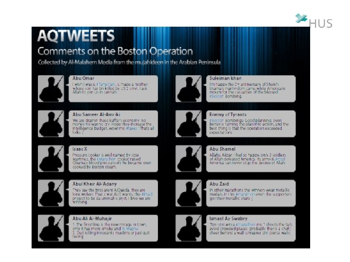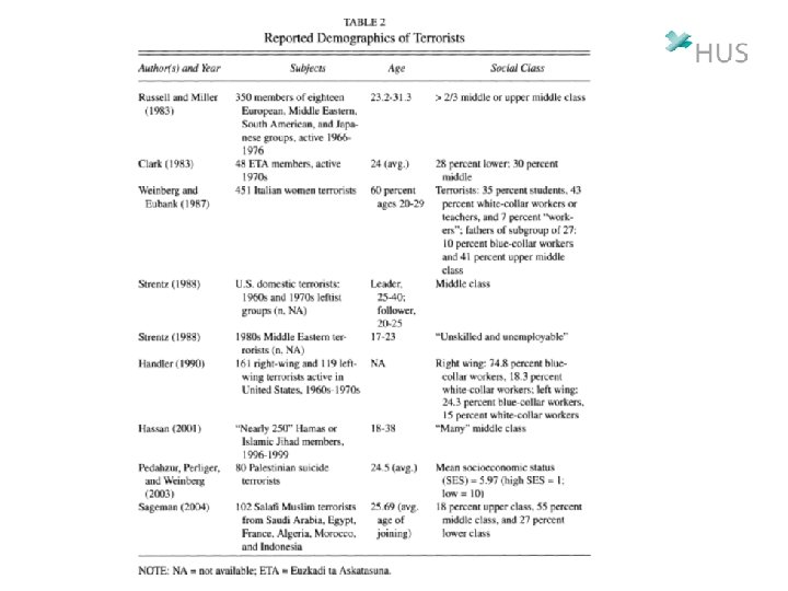 YKSILÖT JOTKA OSALLISTUVAT TERRORISMIIN • Eri rooleja, erilaisia järjestöjä, eri aikakausia: eri psykologisia tyyppejä joita voidaan kuvata eri kriteerein. – 70 -luvn Baader-Meinhof jäsen vs. Palestiinalainen vapautusjärjestön jäsen • Antisosiaalisuus pitää arvioida omasta viiteryhmästä käsin, ei hyökkäyksen kohteen näkökulmasta – Äärioikeistolaisuus vs. äärivasemmistolaisuus • Cognitive functioning and socio-political ideology revisited. James Sidanius 1985. Political Psychology 6: 637 -61.