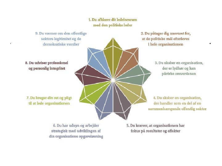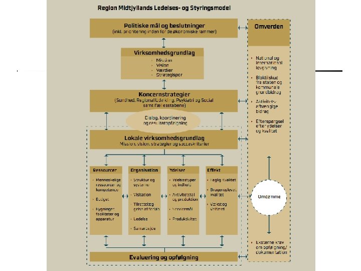 Strategisk ledelse på 8 arenaer Den politiske arena - magtposition i systemet Arena for produktion - teknologi, organisering og styring Den sociale arena - fællesskabsdannelse Den kulturelle arena - vandedannelse Arena for bevidsthedsdannelse og vidensproduktion italesættelse Arena for visioner og tro - meningsfylde Arena for arkitektur og æstetik - signaler, branding, design Markedet som arena - Konkurrenter, salg, DRG