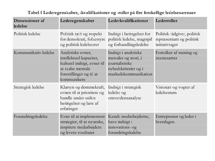 Kontekstforskelle for den offentlige leder Team/fagledelse – Værkfører opgaveløser Projekt/sagsledelse - Koordinator Institutionsledelse - For-stander Virksomhedsledelse – Markedsfører ------politisk nærhed---- Kontorledelse - Magtforvaltning Top/koncernledelse - politikskabere