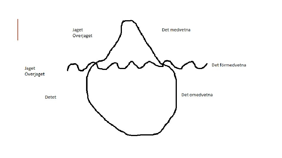DET OMEDVETNA TOPOGRAFISKA MODELLEN Freud ansåg att större delen av människans själsliv är omedvetet. Han delade in människans medvetande i tre delar: medvetet, förmedvetet och omedvetet. Det medvetna: registrerar allt som händer här och nu, tankar, känslor, upplevelser mm. Tillgång till det när man vill. Det förmedvetna: Kan bli medvetet vid uppmärksamhet, tex händelser och minnen som jag lätt kan nå såsom namnet på min första lärare, vad jag åt till middag igår osv. Det omedvetna: Detta är inte tillgängligt på egen hand. Här finns oacceptabel information, som skulle skapa ångest om det nådde det medvetna. Två element: minnen från barndomens tidigaste del, när minnet fortfarande inte utvecklats; och sådant som har funnits i medvetandet men som har trängts undan. Finns en censur – starka spärrar mellan det förmedvetna och det omedvetna, mot allt som finns i det omedvetna. Kan exempelvis avslöjas i freudian slips (när man råkar försäga sig) som då avslöjar ens sanna känslor. Drömmar. Medvetandet kan jämföras med ett isberg där det medvetna är den lilla delen ovanför ytan, det förmedvetna strax under ytan och det omedvetna är den stora delen under ytan.