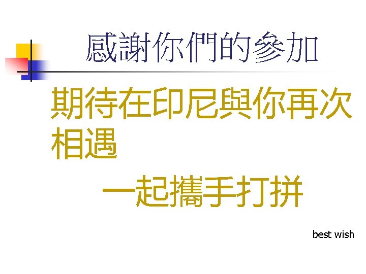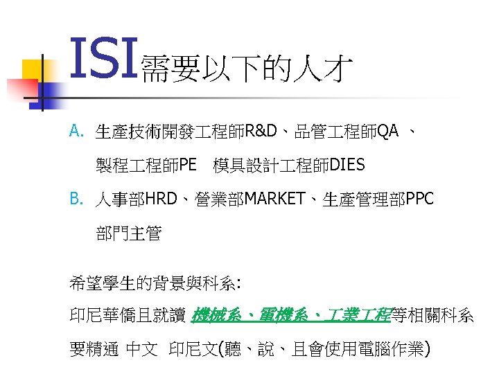 PT. INDOSAFETY SENTOSA INDUSTRY, Manufacturer of Automotive Parts PT. INDOSAFETY SENTOSA INDUSTRY 公司簡介 n Established成立時間 : 1988年 7月18號 n Land佔地面積 : 26. 340 平方公尺 n Building廠房面積 : 13. 000 平方公尺 : Jl. Manis Raya No. 21 Kawasan Industri Manis Tangerang 15810 -Indonesia Telp. 62 -21 -5918601 (Hunting) Fax. 62 -21 -5918913 n 地址 n 新地址 : KARAWANG INDUSTRY MITRA (高速公路 56 km出口旁) n 公司人數 : 550人 Jl. Manis Raya No. 21 Kawasan Industry Manis, Tangerang 15810 -Indonesia phone. 021 -5918601 Fax. 021 -5918913
