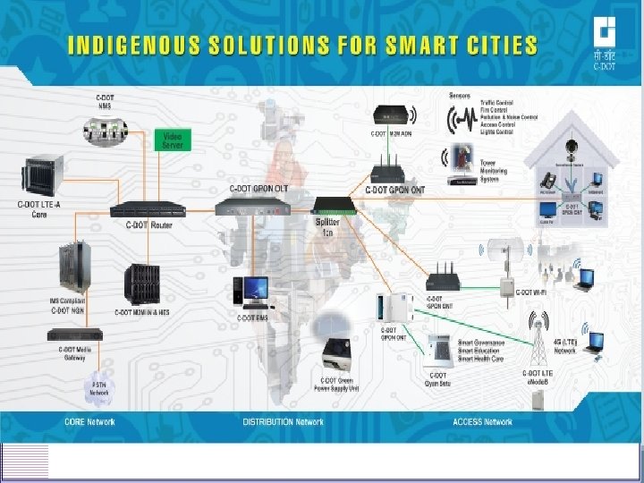 Home Grown Networks Building Blocks from R&D of C-DOT Routing & Switching Optical Transport Wireless Applications & Services Aggregators DWDM Broadband Wireless Terminal NMS Terabit Routers GPON LTE e. Node. B IMS/NGN/ IPPBX Multi-Terabit Routers Suteevra 100 G SAMVAD M 2 M Platform Gyan Setu