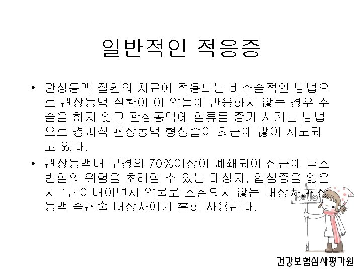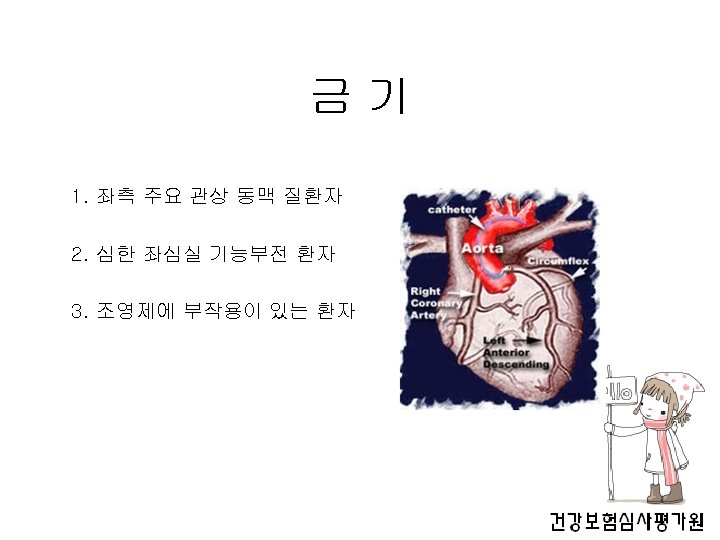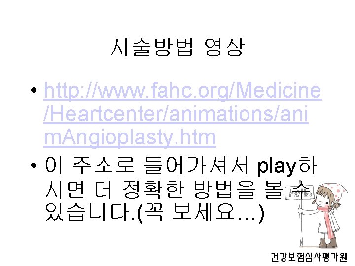 PTCA Percutaneous Transluminal Coronary Angioplasty L Main left Slides: 15 Download presentation PTCA Percutaneous Transluminal Coronary Angioplasty 관상동맥을 알아보자. L Main (left main) LAD (left anterior descending) D (diagonal), S (septal) CX (circumflex) OM (obtuse marginal) RCA (right coronary artery) CB (conus branch) SN (sinus node) Ac. M (acute marginal) PD (posterior descending) PL (posterolateral left ventricular) RAO (right anterior oblique) LAO (left anterior oblique) 시술방법 ⑤ heparin 5000 units + verapamil 2 mg + nitro 200 ng mix해서 sheath를 통해 coronary artery로 주입한다. ⑥ 염료가 주입된 직후 계속 X-ray 촬영을 한다.