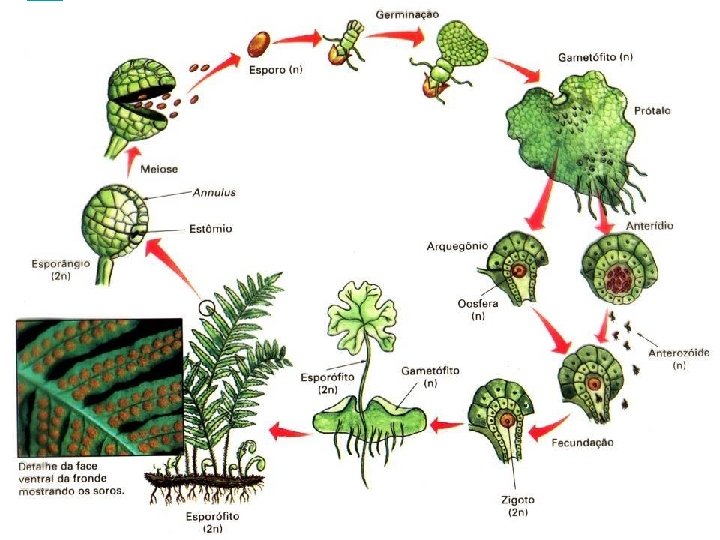 Ciclo de Vida de uma Pteridófita Zigoto (2 n) esporófito (2 n) meiose esporângio esporos (n) prótalo (n) Oosfera (n) arquegônio (n) fecundação anterozóide (n) anterídio (n)