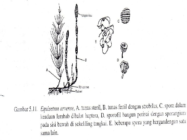 • Spora terdapat dalam sporangium • Sporangium terdapat pada strobilus (kumpulan sporofil) • Spora mempunyai dinding yang terdiri atas endosporangium dan eksosporangium • Lapisan sporangium paling luar terdiri atas dua pita sejajar (heptera) yang dalam keadaan basah membalut spora • Heptera memperlihatkan gerakan higroskopik untuk mempermudah penyebaran spora