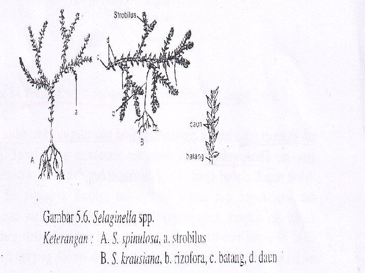 2. Famili Selaginellaceae Ciri-ciri Selaginellaceae – Dikenal sebagai paku rane atau paku lumut – Sebagian batang berbaring, sebagian tegak, bercabang menggarpu anisotom. – Kebanyakan hidup ditempat yang teduh – Didekat percabangan batang terdapat alat tambahan yang dinamakan rizofora (pendukung akar). – Daun berupa mikrofil, dan terdapat suatu sisik yang dinamakan lidah (ligula). – Ligula berfungsi menghisap air dan mempunyai hubungan dengan berkas pembuluh pengangkut.