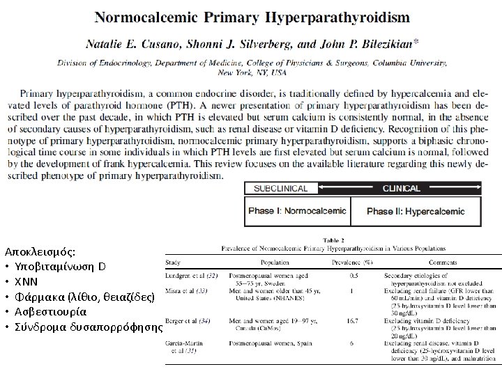 Η ΜΟΝΤΕΡΝΑ ΚΛΙΝΙΚΗ ΕΙΚΟΝΑ ΤΟΥ ΠΡΩΤΟΓΕΝΟΥΣ ΥΠΕΡΠΑΡΑΘΥΡΕΟΕΙΔΙΣΜΟΥ Cope et al. 19301965 Nεφρολιθίαση Heath et al. Mallette et 1965 -1974 al. 1965 -1974 Silverberg, Bilezikian et al. 1984 -2006 57% 51% 37% 17% Not reported 36% 40% 39% Εμφανής σκελετική νόσος 23% 10% 14% 1. 4% Ασυμπτωματικός 0. 6% 18% 22% 80% Υπερασβεστιουρία Silverberg SJ and Bilezikian JP (2006)