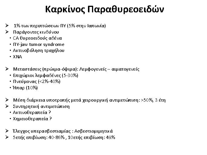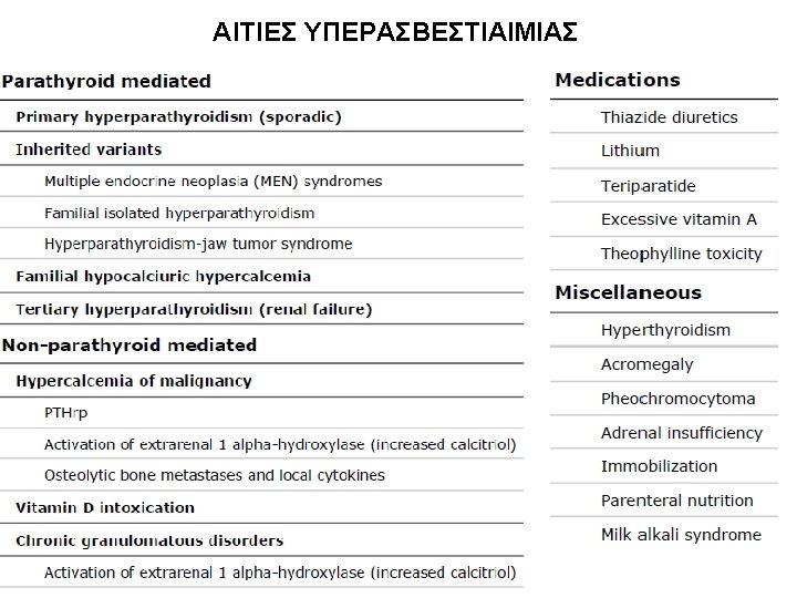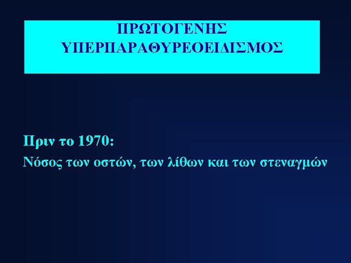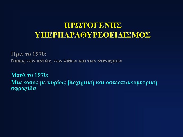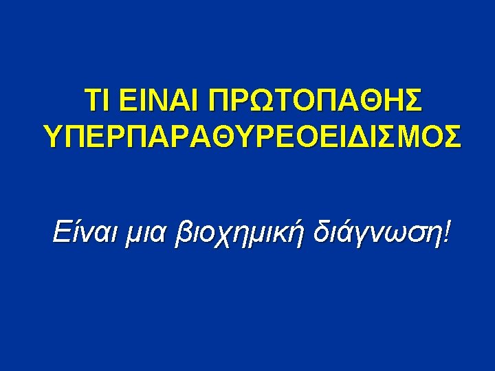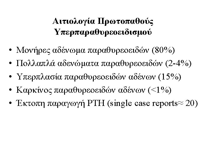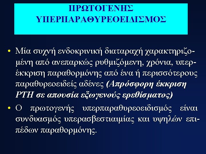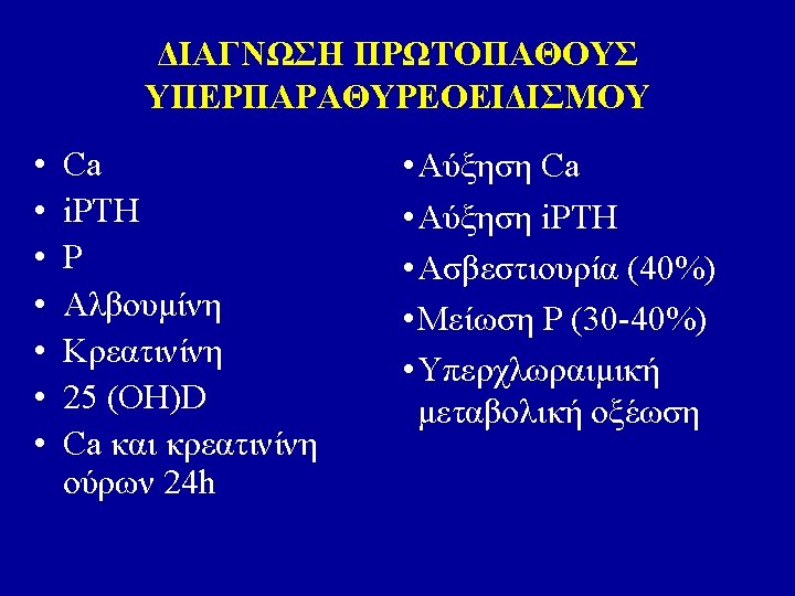 ΚΛΙΝΙΚΕΣ ΕΚΔΗΛΩΣΕΙΣ ΠΡΩΤΟΓΕΝΟΥΣ ΥΠΕΡΠΑΡΑΘΥΡΕΟΕΙΔΙΣΜΟΥ 1. Asymptomatic hypercalcemia detected by routine biochemical screening 2. Symptomatic hypercalcemia 3. During evaluation for manifestations of hyperparathyroidism such as osteopenia, osteoporosis, or nephrolithiasis 4. Rarely, hyperparathyroid bone disease (osteitis fibrosa cystica) or parathyroid crisis