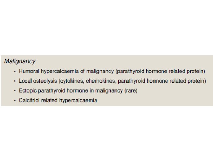 Symptoms and signs of excess parathyroid hormone secretion • • • Symptoms and signs of hypercalcemia Bone disease Nephrolithiasis Hypophosphatemia Increased production of calcitriol Proximal renal tubular acidosis Hypomagnesemia Hyperuricemia and gout Anemia