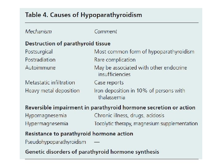 Hypocalcemia Basic investigations to establish a specific diagnosis, along with more specialized tests that might be required in specific cases Basic investigations • Serum calcium (corrected) • Phosphate • Magnesium • Electrolytes • Creatinine • Alkaline phosphatase • Parathyroid hormone • 25 -hydroxyvitamin D • Serum p. H • Complete blood count Further investigations • Ionized calcium • 24 -hour urinary phosphate, calcium, magnesium, and creatinine • 1, 25 -dihydroxyvitamin D • Renal ultrasonography to assess for nephrolithiasis • DNA sequencing to exclude genetic mutations • Biochemistry in first-degree family members