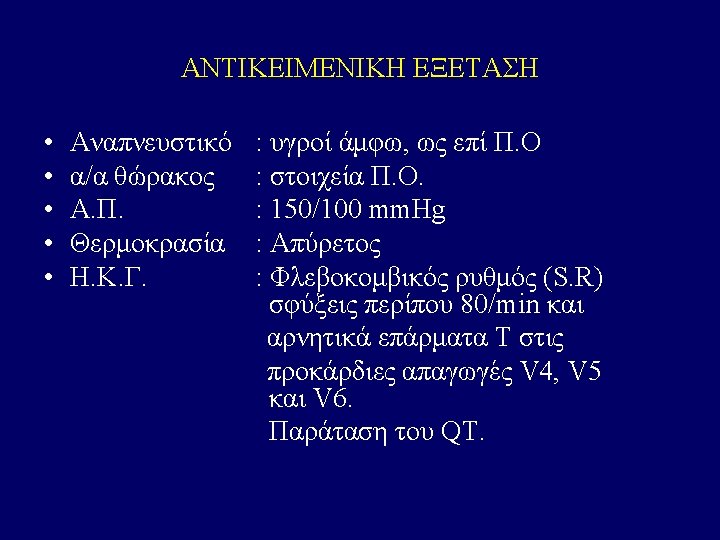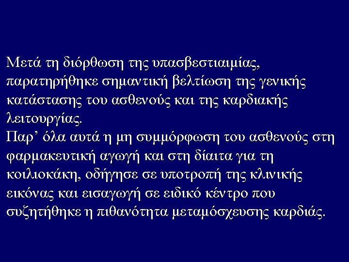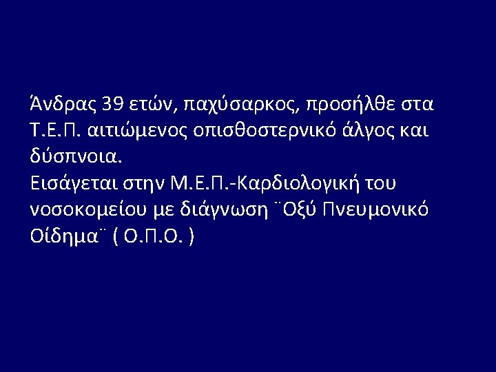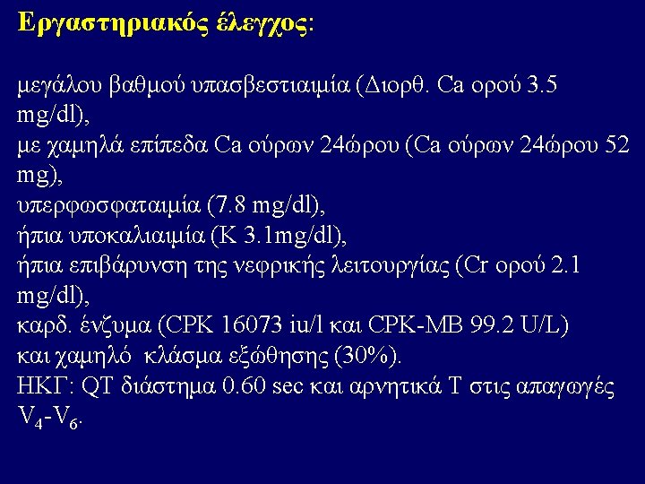 • W. B. C 7. 910 / u. L. , Neu 76 %, Lymph. . 8 %, Mono 15 %, Ht 32. 1 %, M. C. V. 74. 6 f. L, M. C. H. 22. 9 pg, P. L. T. 378. 000 /u. L, Σάκχαρο 117 mg/dl, Ουρία 65 mg/dl, Κρεατινίνη 2. 1 mg/dl, Αμυλάση 141. U/L, Ολ. Χολερυθρίνη 0. 3 mg/dl, Χοληστερίνη 104 mg/dl, Τριγλυκερίδια 68 mg/dl, Ολ. Λευκώματα 6. 4 g/d. L, Αλβουμίνη 5. 0 g/d. L, Ουρικό οξύ 8. 9 mg/d. L , SGOT 63 U/L, SGPT 58 U/L, ALP 69 U/L, γGT 36 U/L, LDH 521 U/L, Na 139 mmol/L, K 3. 0 mmol/L, Ca 3, 9 mg /dl • Αέρια αίματος : p. H 7. 36, p. CO 2 23 mm Hg, p. O 2 120 mm Hg ( με μάσκα Venturi ), HCO 3 13 mmol / L, Lact 10. 7 mmol / L, • SO 2 : 99 %, Σάκχαρο 243 mg / dl