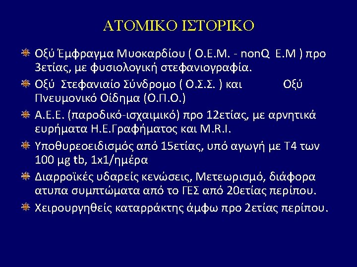 Φαρμακευτική αγωγή κατά τη νοσηλεία του : -Clexane 80 mg 1 x 2 -Salospir 100 mg tb 1 x 1 -Plavix 75 mg tb 1 x 1 -Lasix 20 mg amp 2 x 2 -Dilatrend 6. 25 mg tb ½x 2 -Zestril 5 mg tb 1 x 1 -Lexotanil 3 mg tb 1 x 1 -Losec 20 mg amp 1 x 1 -Integrilin (αναστολέας γλυκοπρωτείνης IIb/IIIa ) amp με ροή έγχυσης 18 ml/h