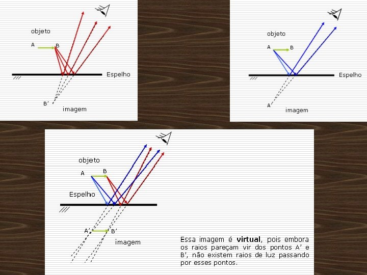 CONSTRUÇÃO DAS IMAGENS n Para que um observador consiga ver a imagem refletida pelo espelho é preciso que raios provenientes do objeto sejam refletidos pelo espelho e alcancem seu olho. Isto pode acontecer para diferentes posições do observador.