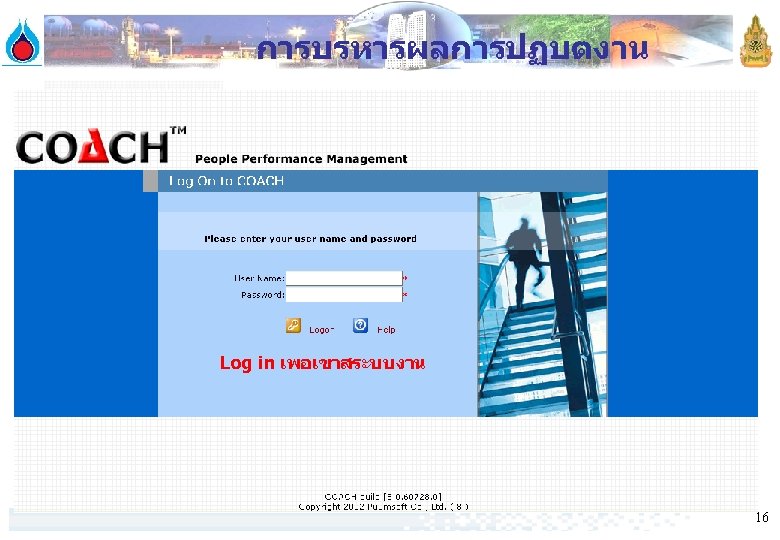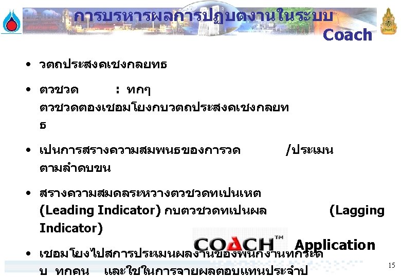 การบรหารผลการปฏบตงานในระบบ COACH SYSTEM พนกงาน (Subordinate) COACH OTHERS SYSTEM ผบงคบบญชา (Line Manager) OPERATION MODULE Start Set Objective Set Measure No Objective & Measure Allocate Budget Approve Yes Final Grade Update Actual Value EVALUATION MODULE Self Evaluate Appraisal End Evaluate (Appraisal) Approved Rating & Comment Final Evaluation Final Grade HR SAP Final Grade Pay Slip 14