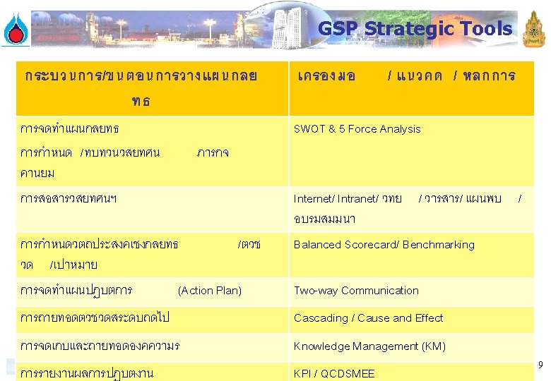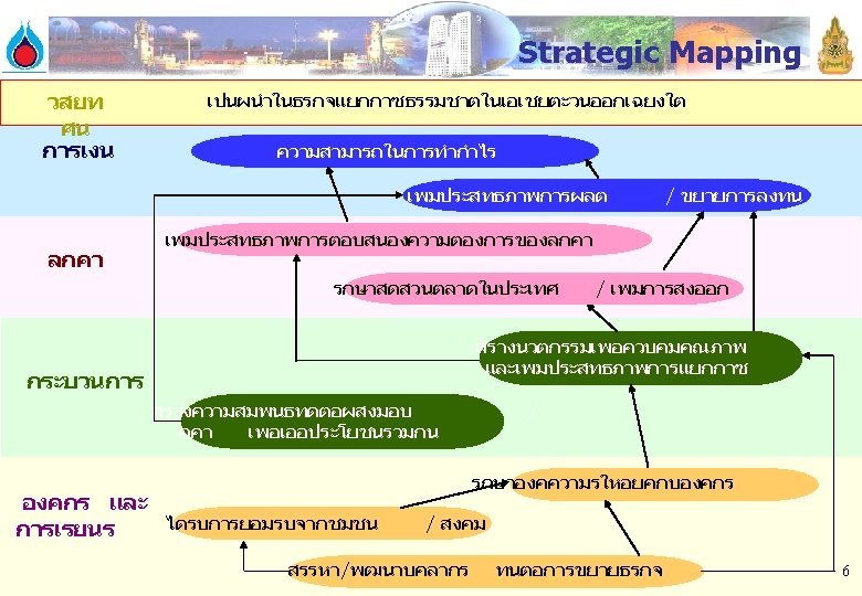 PTT Gas Vision “To be a regional gas leader” 1 GSP Vision Grow domestically 2 Monetize on value-add opportunities 3 Manage regulation 4 Expand beyond Thailand in related businesses 5 Achieve operational excellence SWOT & 5 -Force Analysis “����� �� ����������� ” GSP Strategy 1. เพมประสทธภาพในการผลต 2. มงเนนการเพมประสทธภาพการต อบ สนองความตองการของลกคา 3. สรางนวตกรรมในการควบคมคณภาพ ผลตภณฑ. 4 5