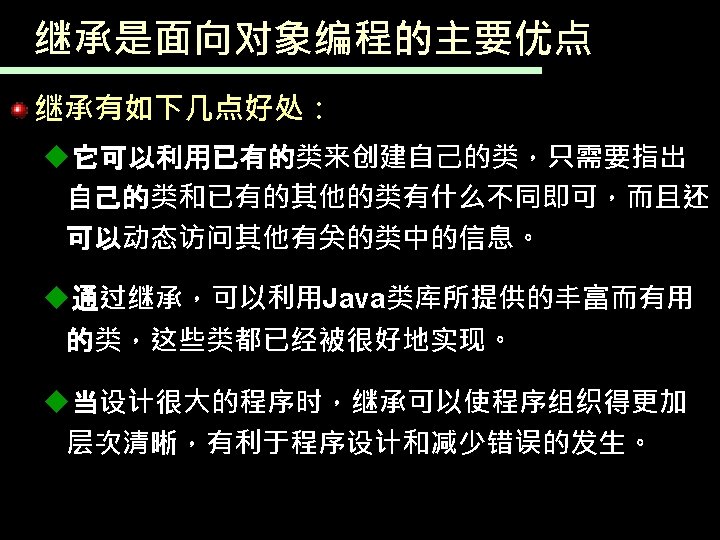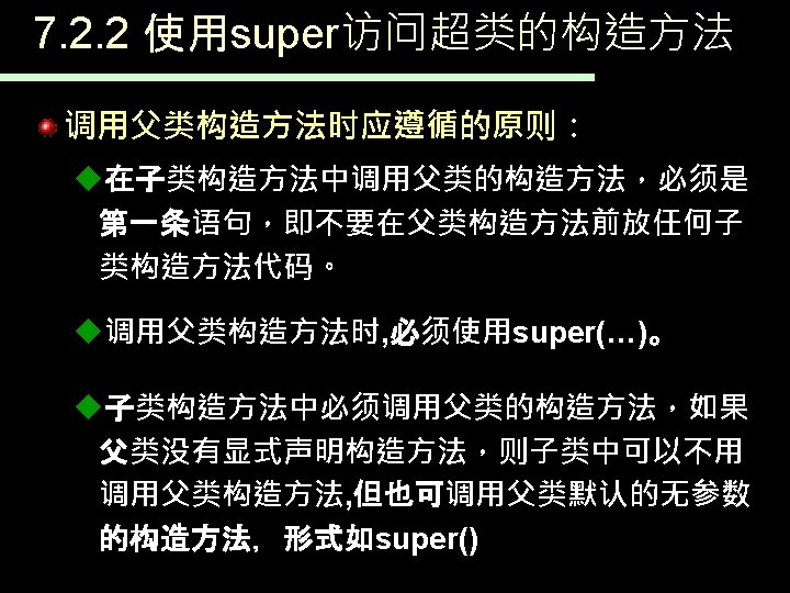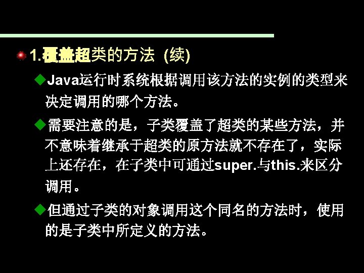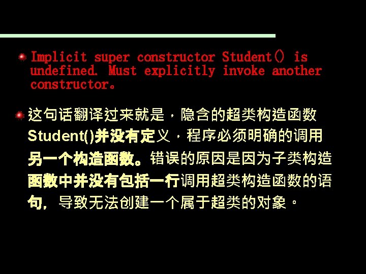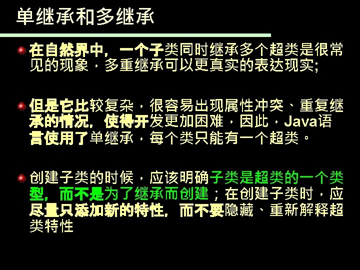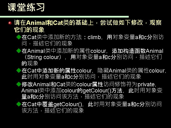 一个继承于Student的子类 public class Postgraduate extends Student{ String orientation; //增加了研究方向 public Postgraduate(String studentid, String name, : Postgraduate student String orientation) { super(studentid, name); //调用超类Student的构造函数 obj : Student this. orientation = orientation; studentid = 001 } name = Zhuhua public void change. Orientation(String nwe. Orientation){ //变更研究方向 speciality this. orientation=nwe. Orientation; Orientation = AI } public static void main(String[] args 0){ Postgraduate student=new Postgraduate("001", "Zhuhua", "AI"); student. assign. Speciality("Computer Science"); System. out. println(student); //默认执行超类的to. String(), } }