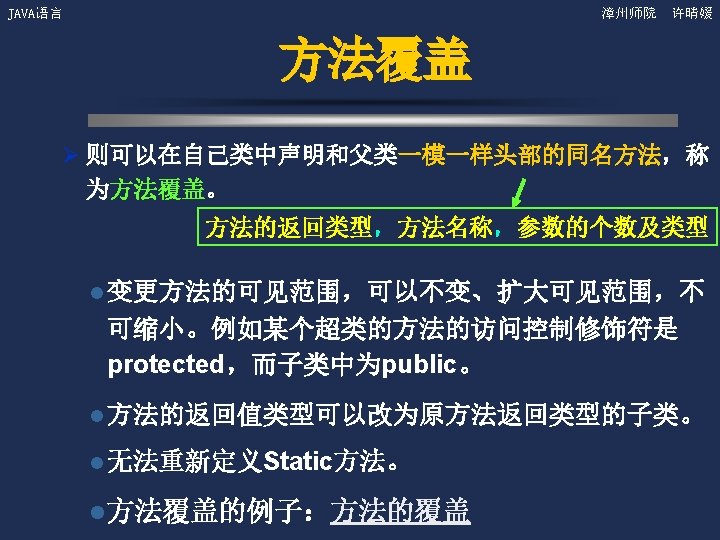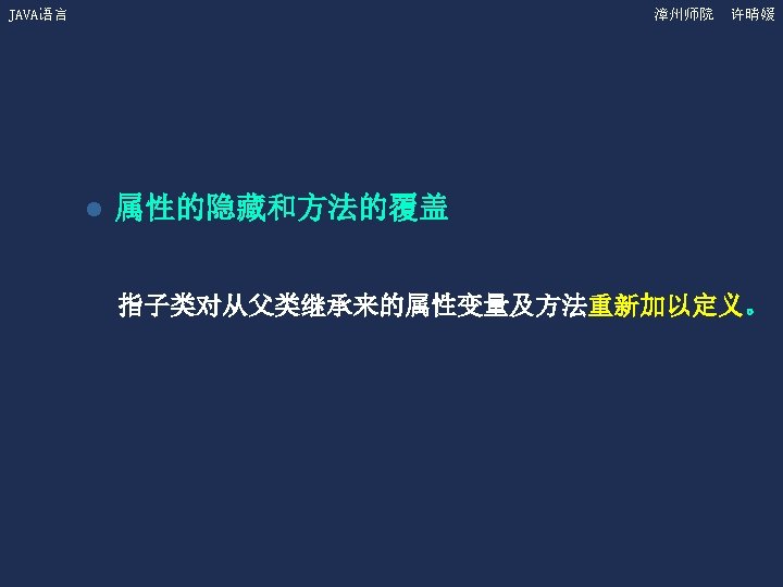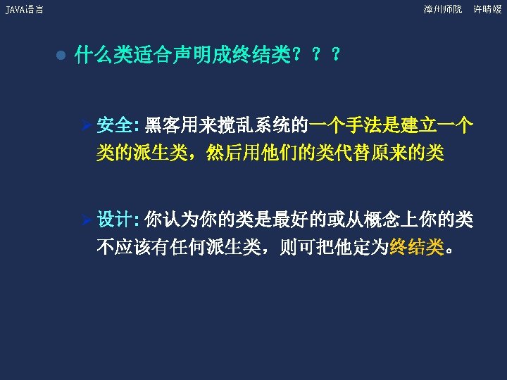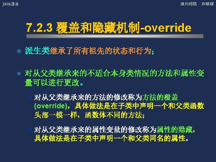 JAVA语言 漳州师院 许晴媛 4. 2 Object类(续) ——equals方法 的重写 l 在Bank. Account类中增加equals方法。 public boolean equals(Object x) { if (this. get. Class() != x. get. Class()) return false; Bank. Account b = (Bank. Account) x; return ((this. get. Owner. Name(). equals(b. get. Owner. Name())) &&(this. get. Account. Number() = = b. get. Account. Number()) &&(this. get. Balance() = = b. get. Balance())); }
