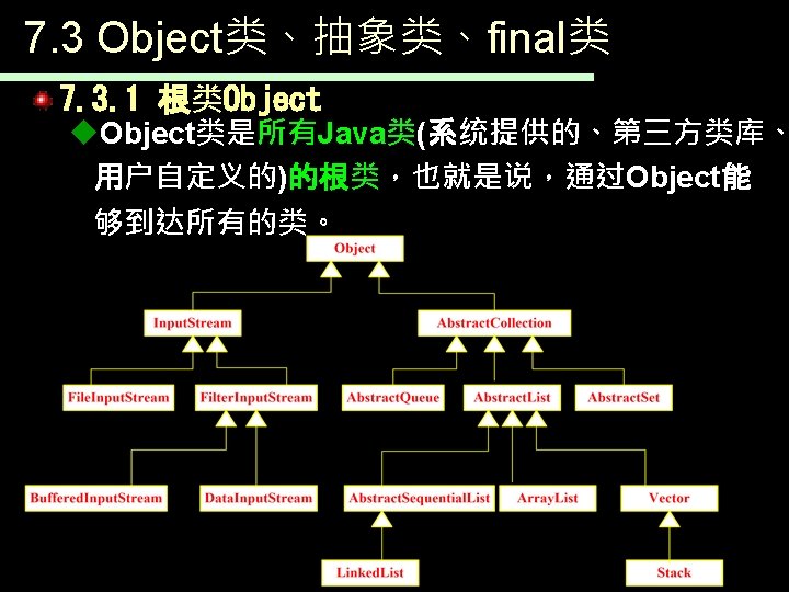 7. 3 Object类、抽象类、final类 Object public class Object{ public Object(){…} public final Class<? extends Object> get. Class(){…} public String to. String(){…} public int hash. Code(){…} public boolean equals(Object obj) {…} protected Object clone() throws Clone. Not. Supported. Exception{…} public final void notify(){…} public final void notify. All(){…} public final void wait(…) throws Interrupted. Exception{…} protected void finalize() throws Throwable{…} }